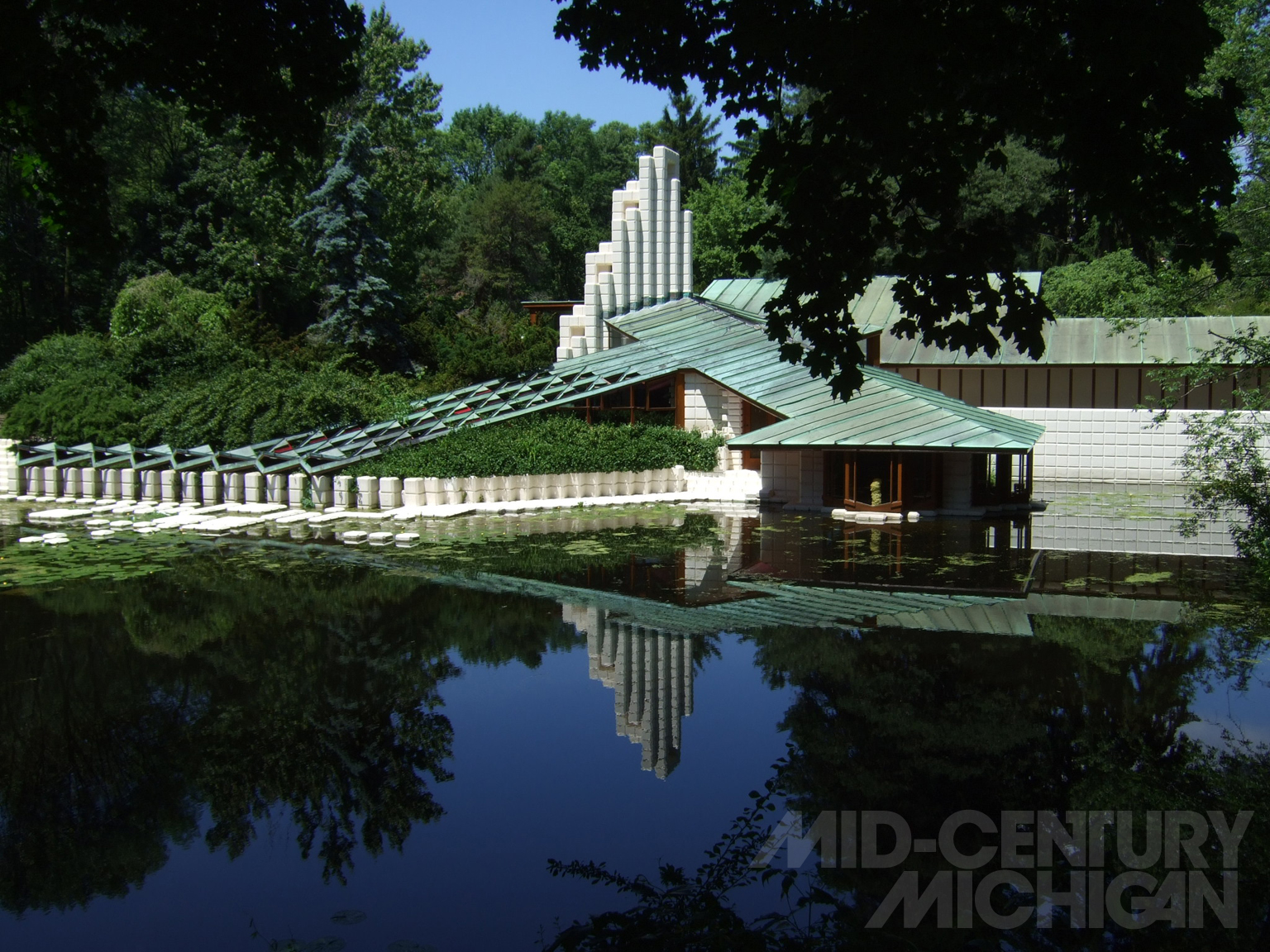 In the meantime, I leave you with an image I shot of Alden B. Dow’s own home and studio, which I had the extreme pleasure of touring last summer with my grandmother and a good friend. Surrounded by a flood-proof moat, one can literally exit through patio doors and walk on water, thanks to abundant stepping-stones. Upon entering the building, steps lead down like a waterfall into a semi-submerged conference area, which is seen at the end of the sloping roof on the right.