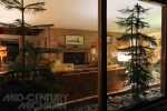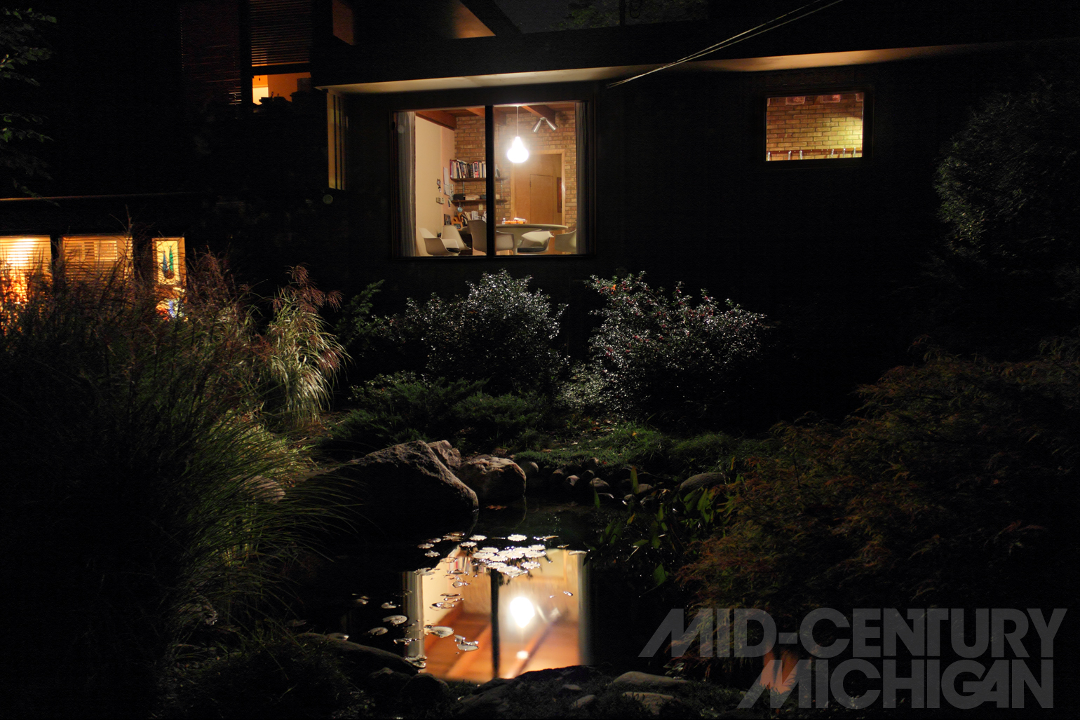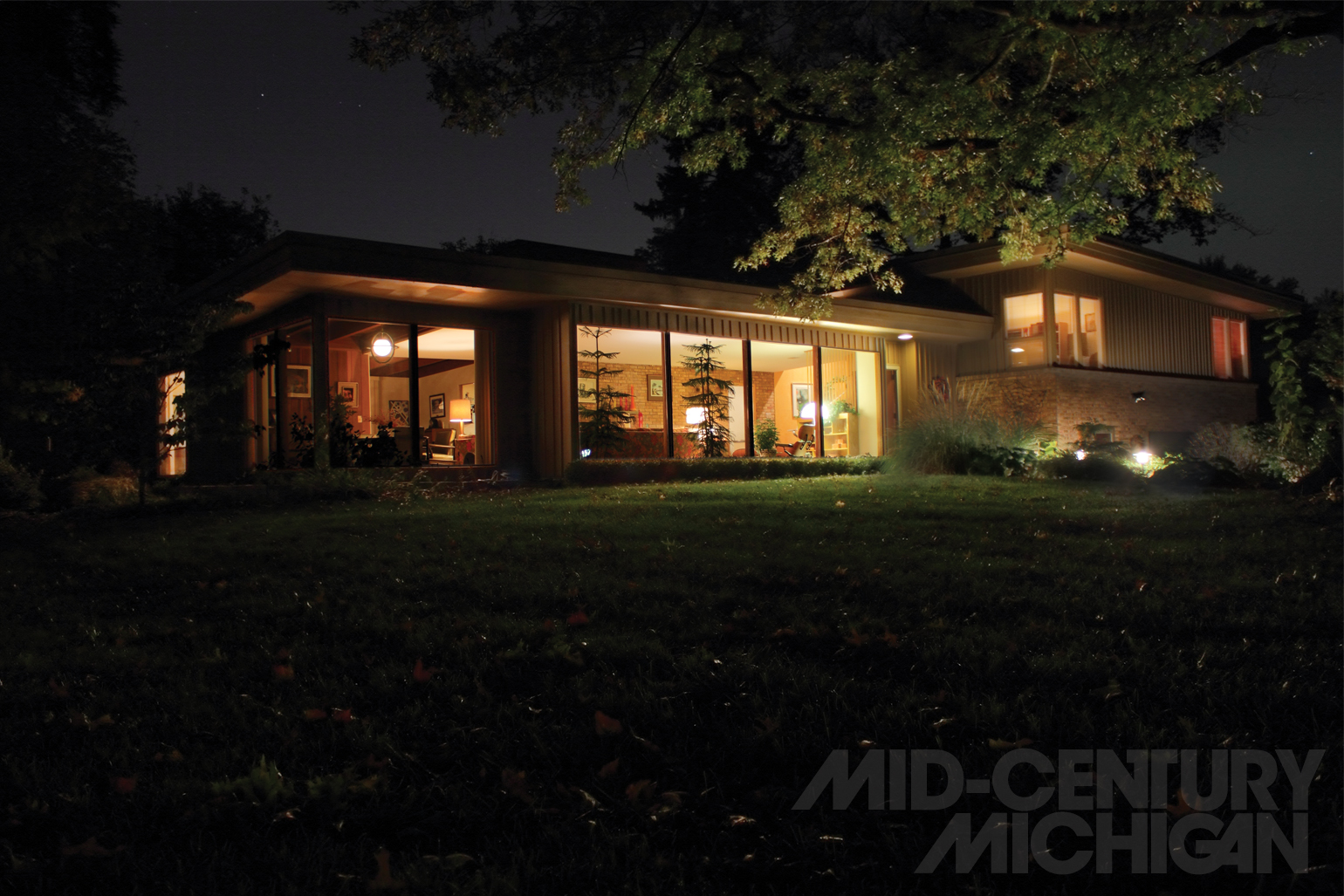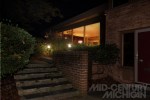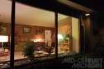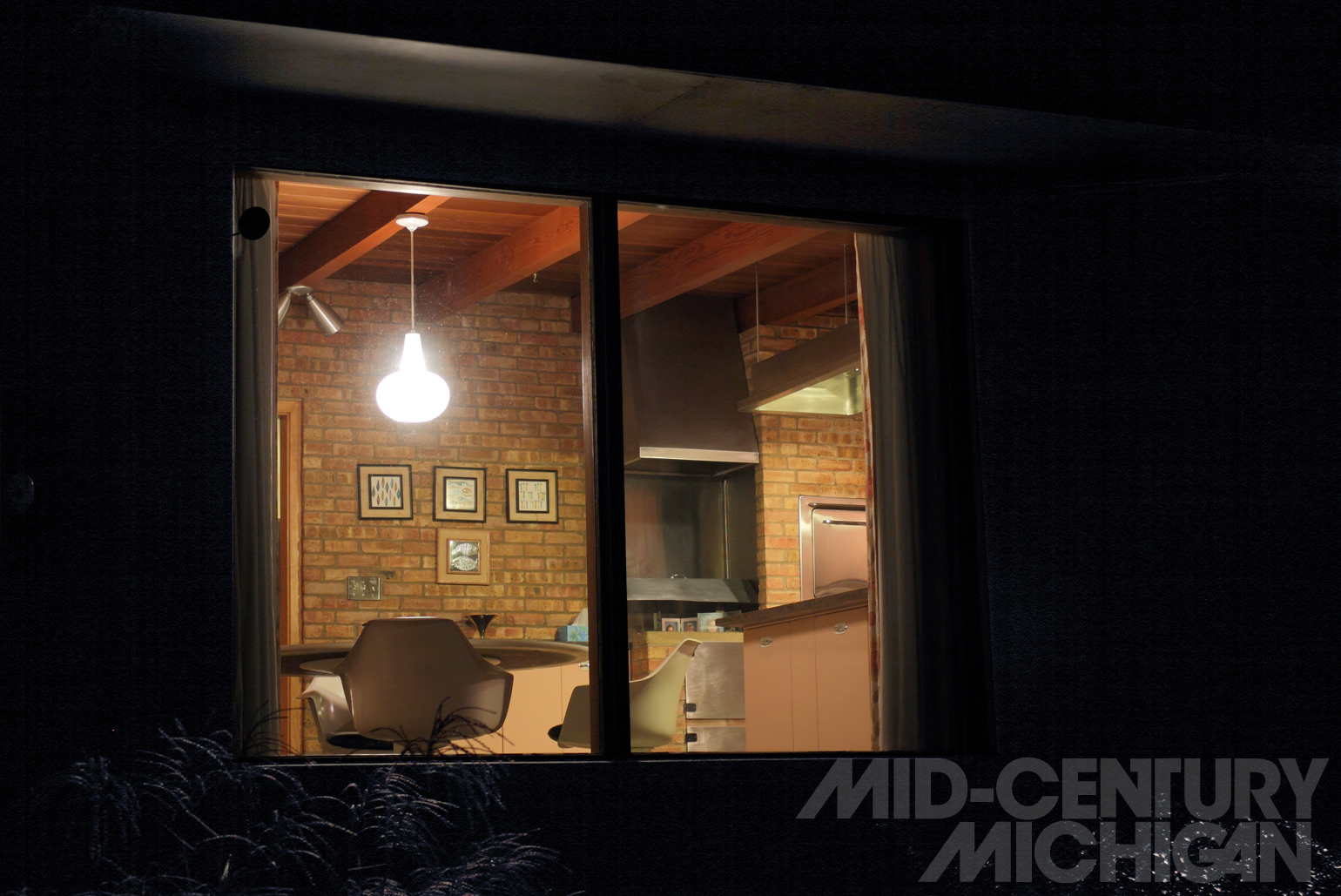 Settled on a quiet side street in East Grand Rapids lies a time-machine from 1954. It is nighttime, perfect for gazing into the inner architecture of this unit. With its interior lit up like a showroom, there is little to stop an admiring gaze through the long curtain glass façade. What meets the eye is a transparent jewelry box of forms and materials. Exposed brick, lounge furniture, wood veneer, and atomic light fixtures all evoke a sense of the future past. Trees growing from a planter bed inside of the house dissolve the visual barrier of interior and exterior. The separation between the living room and the outdoors becomes nearly indistinguishable.