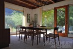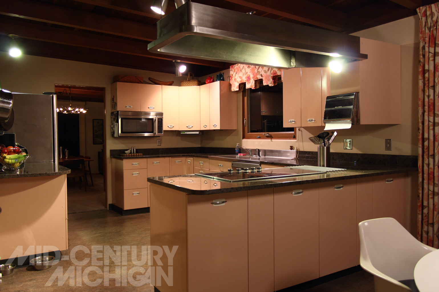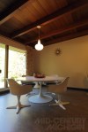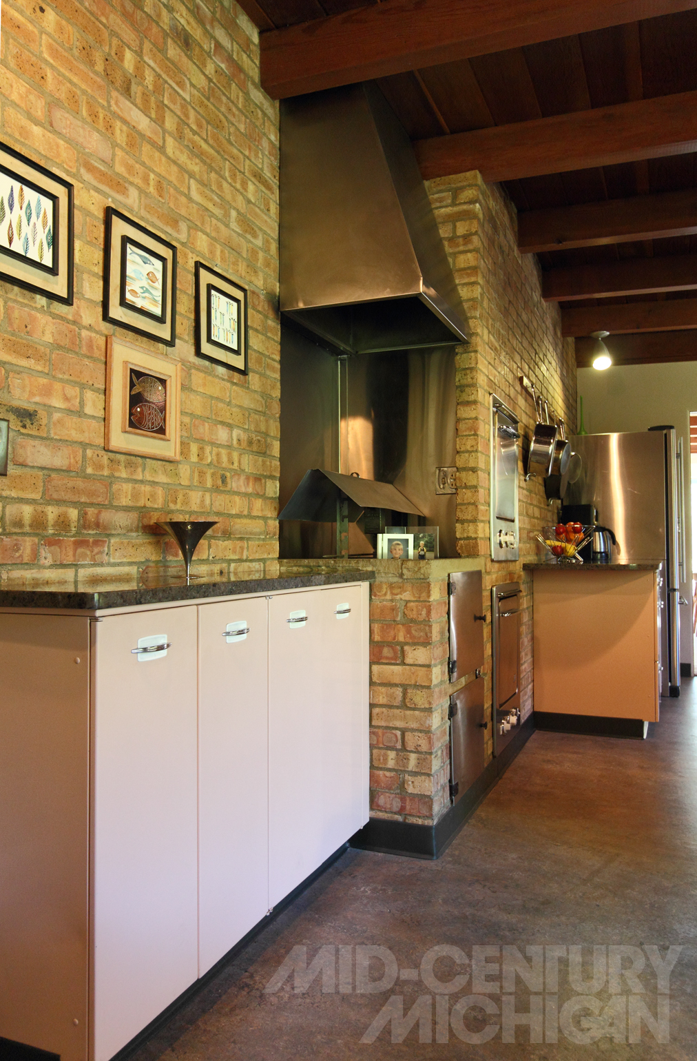 This visually rich interior space is the perfect setting for all of the mid-century modern furniture and fixtures found throughout the home. Many of the pieces came with the house, such as the Saarinen-inspired tulip table by Burke, which is located in the kitchen’s breakfast nook. Of the few changes made to the interior, the most were were made here in the kitchen. Naturally, David and Elaine took great care and sensitivity to preserve the vintage look when they remodeled. For example, original features remain, such as the original double-ovens built into the brick wall. (Shortly after the photo shoot, the ovens were updated.) Also set into this wall is the indoor barbecue grill with commercial grade exhaust hood. David chose to update the grill with a gas flame. The cabinetry was also updated with vintage metal Geneva cabinets electro-statically repainted in their original pink color. “With all this metal, this kitchen just gleams at night,” David adds.