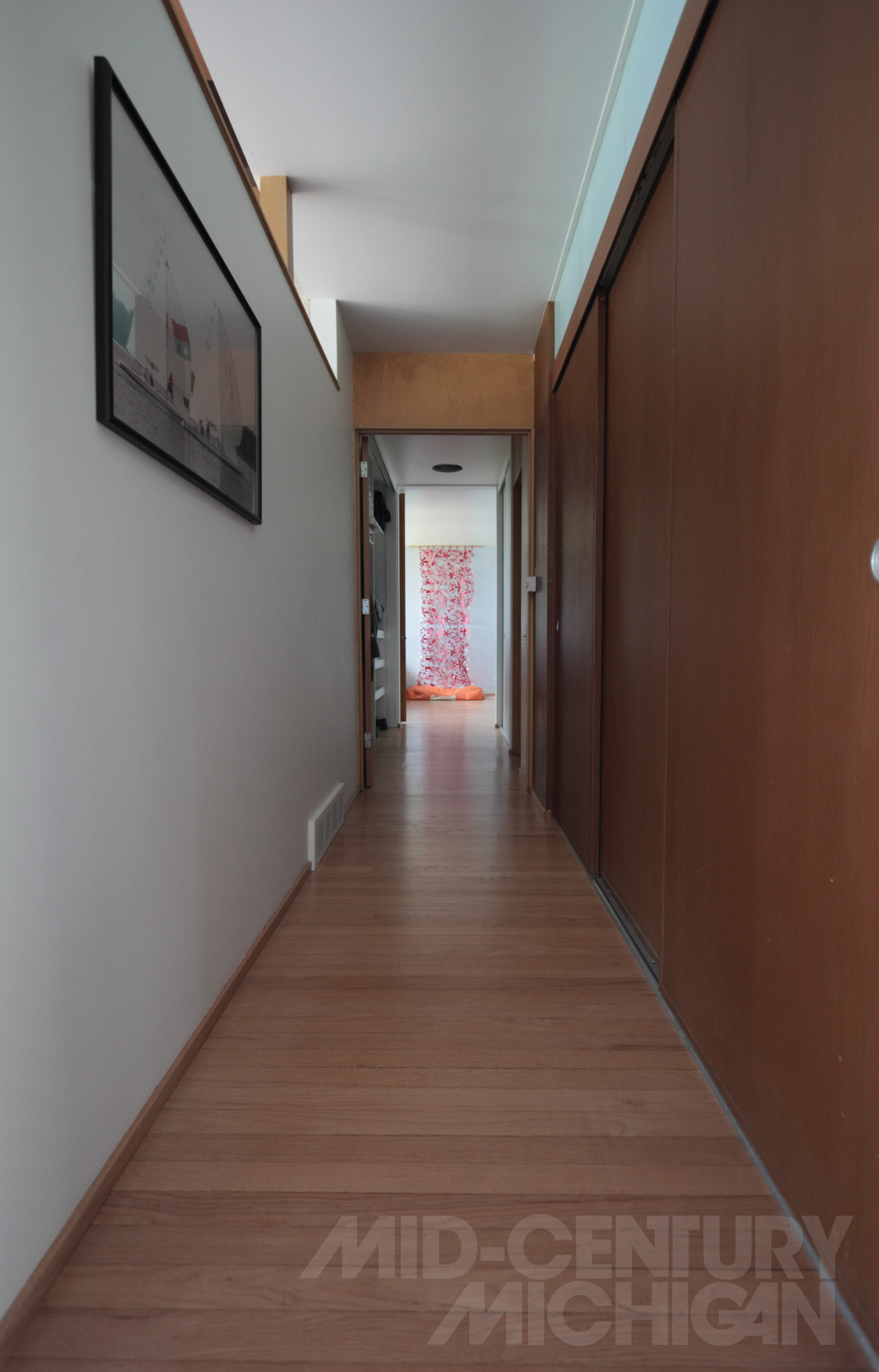 “We’re very good about taking pictures and documenting it every time we make a change, and we have things labeled and packed away in the basement,” Katie explains. Despite their commitment to preserve, some of the original features of the house are starting to show their age and have needed to be either modified or replaced; for example, the bands of windows in the kitchen and dining room. “They used to be very California modern,” says Katie. “You could barely see the frame. However, this isn’t California, and you also couldn’t see out of them in the winter, as they’d completely ice over.” Another example are the glass light fixtures in the hallway ceiling leading to the master bedroom, which are meant to illuminate the closets the hallway is lined with. “We never put the light fixtures back, because they are so degraded,” says Katie. “I think there is lead in the glass, so it is rather gray, and sheds very little light, and so we can’t really see what we’re picking out in the morning.” One major change was made in the master bedroom when they first bought the house. Small, uninsulated MDF panels above the bed (which flapped open to allow a cross-breeze) had let water run in, ruining a bookend-veneered birch panel with built in twin headboards. This, however, wasn’t a great loss for the couple, who couldn’t imagine twin beds in the master bedroom. “I’d like to re-veneer that wall again. My husband, however, has other ideas in mind,” Katie adds.