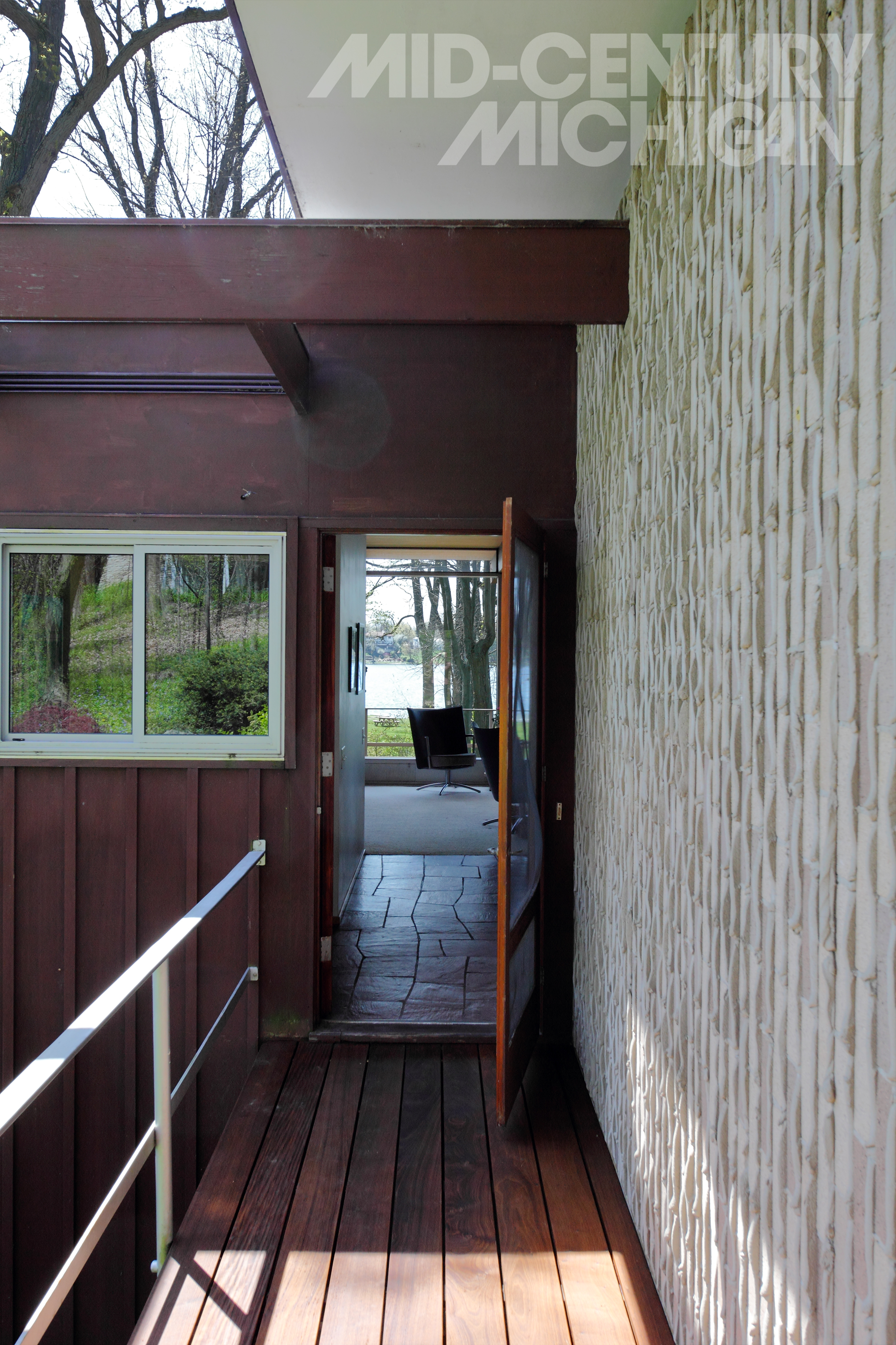 Built in 1962 as a retirement home for Grand Rapids’ first neurosurgeon, Carl List and his wife Eva, the scale of the home reflects that it was built for two. Its position on Reeds Lake in East Grand Rapids comes as no surprise, as it is nestled amongst an enclave of other mid-century modern homes on a tree lined cul-de-sac. Upon approach, the street view reveals a false indication of the overall experience of the house because of its orientation. Built into a hillside, the main living spaces hover above the garage, with other portions of the home hidden from view. The exterior is primarily Philippine Mahogany siding, vertical brick, and glass. At night, the exterior remains well lit, a request of Dr. List, who often worked late shifts at the hospital. A reflecting pool at the end of the driveway is an unmistakable Neutra touch.
