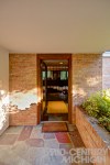 Materials such as slate, marble, brick, cherry, and rosewood compose the interior surfaces. The formal living and dining area make the most of the materials, with exposed brick walls and a cascading floor plan which descends from dining area to living area. A long, suspended rosewood-clad credenza spans this change of levels, supported by a series of balusters which are anchored to the floor and ceiling. A wall of glass looks out onto a bi-level patio, enclosed by a short wall of brick. At the far end of the room, a wide, low fireplace sprawls across an entire wall.