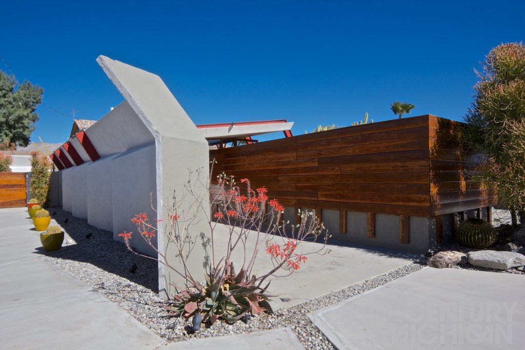 Situated in a quiet residential cluster along a sparse stretch of desert highway in Coachella Valley, The Lautner Compound (as it is now called) is perhaps one of the only Lautner sites where visitors can pay a visit, as most of his works are privately occupied residences. To the approaching visitor, the location suddenly appears almost as if out of nowhere amongst the nondescript facades that dot its sleepy residential surroundings. The modest, yet stylish redwood and concrete privacy walls seen from the street view neatly conceal the surprise that awaits within this boutique hotel, and event space. Equally surprising is the story of this landmark’s neglected past.