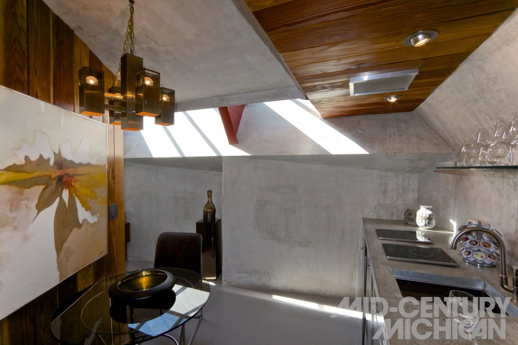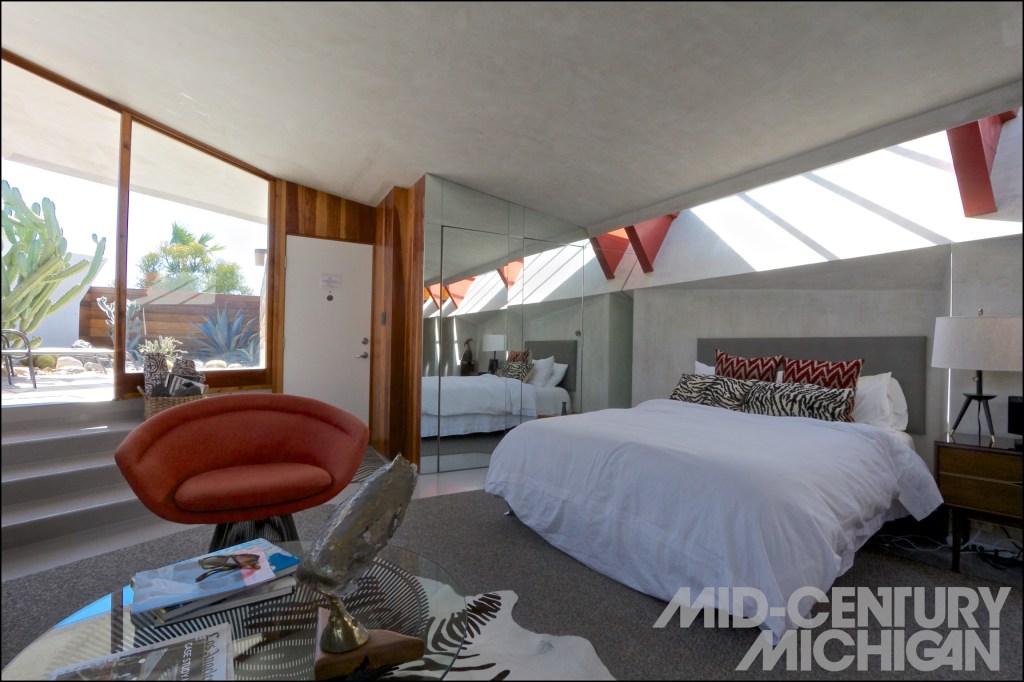 Beckmann, an interior designer, and Trowbridge, a Michigan Native and furniture designer, were inspired by the vision of this futuristic enclave of “living units” (as Lautner called them), and saw an opportunity to recreate, in part, the vision Hubbard and Lautner were never able to fully realize. After three-and-a-half years of renovation, the result is what they call a “micro resort.” Their diehard modernist influence shows not only in the period appropriate furnishings (which are unique to each unit), but also in finishes, material choices, and custom furniture designed and built by Trowbridge. Take, for example, the custom built steel and redwood bed frames with their attached, floating nightstands that carefully hug the complex sawtooth form of the interior concrete walls. Such site-specific design choices show a deep understanding of Lautner’s design. Carefully selected accoutrements such as a collection of vintage LP’s and a record player, books, and vintage photographs dot the rooms. Modernist furniture of design pedigree both chronicled and obscure create comfortable places to lounge while dramatic lighting chosen by Beckmann bring back the primary element The Lautner Compound had been devoid of for most of its life – a soul – and an understanding and appreciation of Latuner’s work.